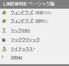 ウィンドーズ及び Linux のユーザーはスピードとパフォーマンス向上のため、JREをダウンロードすることをお勧めします。サン社のページからどうぞ。http://java.sun.com/j2se/1.4.2/download.html※このバージョンを使うに当たっては既に Java2TM Runtime 環境, v. 1.3.1 (JRE) がインストールされている必要があります。 http://java.sun.com/j2se/1.3/download.html http://www.limewire.com/japanese/content/home.shtml ココにジャンプ ウィンドウズ(英語のみ)をクリック! あとはコチラのインストールから順に進めてください。 http://www.limewire.com/japanese/content/ug_installation.shtml インストールが完了しましたらコチラのユーザーガイドを参考にし、後はお好きなファイルを お好きなだけGETして下さい! http://www.limewire.com/japanese/content/userguide.shtml Lime Wire ホームページ http://www.limewire.com/english/content/support.shtml LimeWire PRO版を手に入れたい方はライムの検索画面で 【LimeWireまたはLimeWirePRO,またはLimeWirePRO4.12.3】と入力し検索して下さい。 なるべく最初に、ファイルを選択してから検索する方が絞れるかもしれません。 zipファイルになっているものがいいでしょう。 インストールする時に何度か止まりますが(無視)を押し続けてください |
